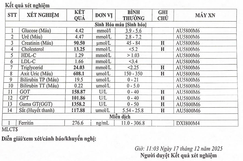 BS Hiệp kể, bệnh nhân đi khám sức khỏe định kỳ, vô tình nhận được kết quả xét nghiệm sinh hóa với các chỉ số cao vút: Axit uric (máu) 608,1 mmol/l (mức bình thường là 150-350 mmol/l), creatinine (máu) 90,5 µmol/L (mức bình thường là 45-84 µmol/L), cholesterol 13,25 mmol/L (mức bình thường là <5,2 mmol/L), triglyceride là 24,03 mmol/L (bình thường là <2,25 mmol/L), GOT cao đến 158,87 U/L (mức bình thường 0-40 U/L), Gama GT (GGT) cao vút 1358.2 U/L (mức bình thường 0-50 U/L), sắt (huyết thanh) 117.88 umol/L (mức bình thường 5.54-25.8 umol/L), cho thấy men gan, mỡ máu tăng cao vút.