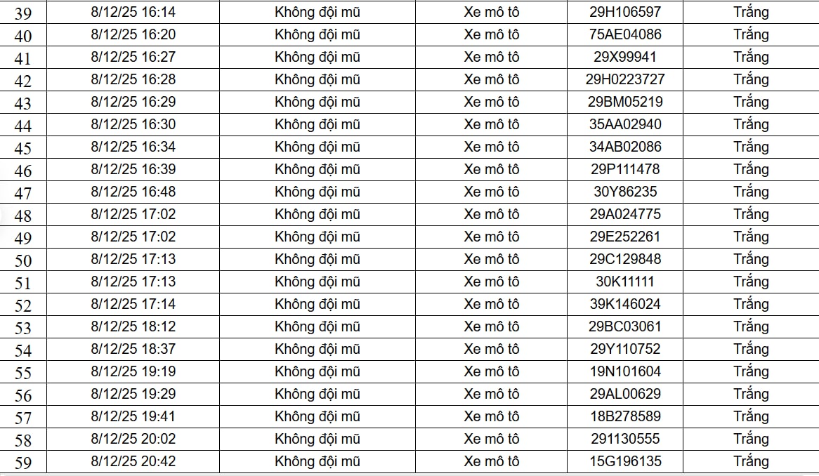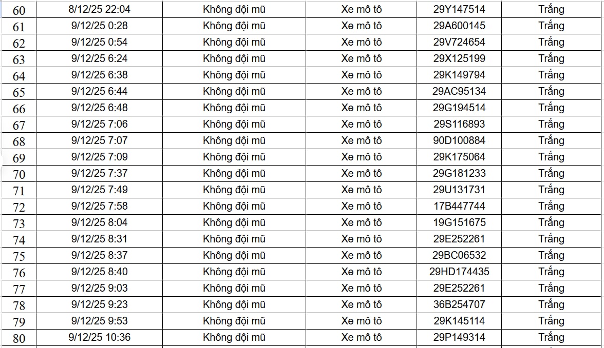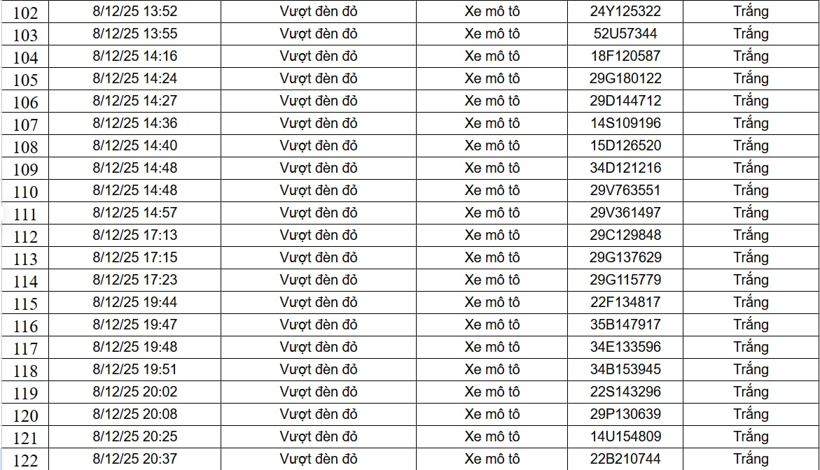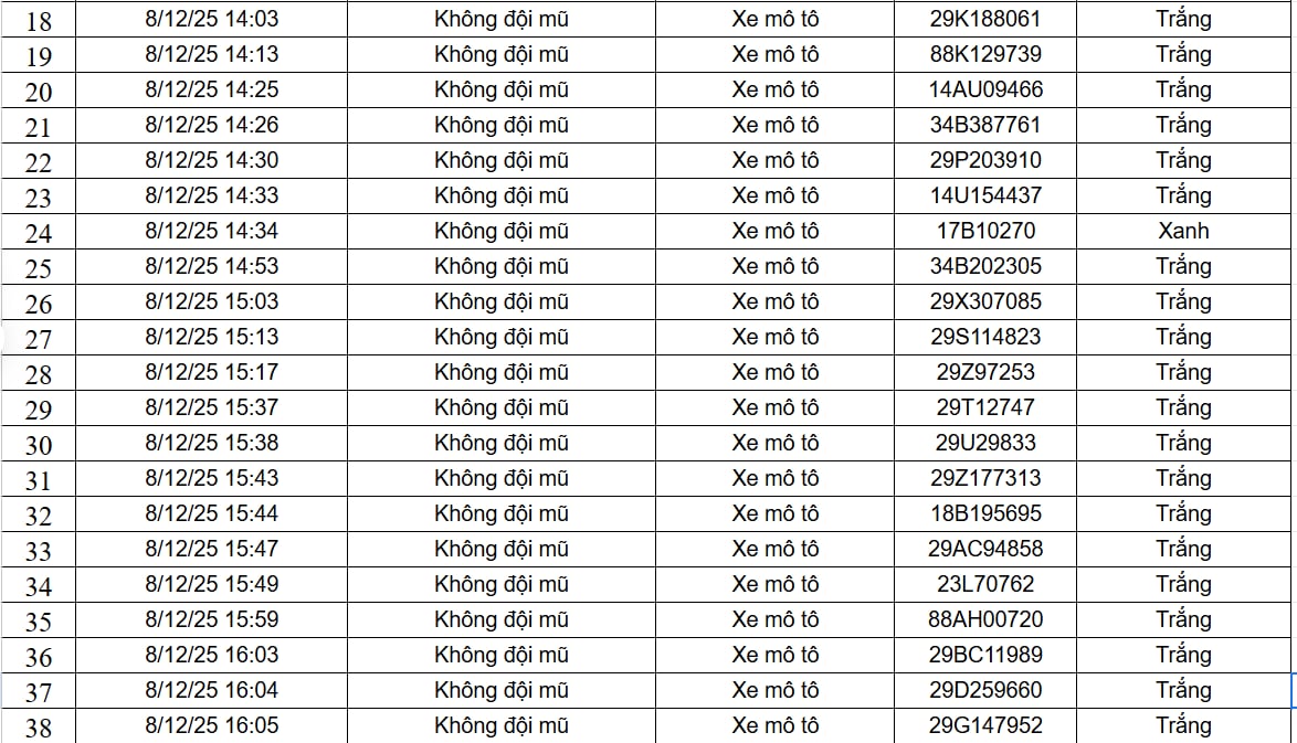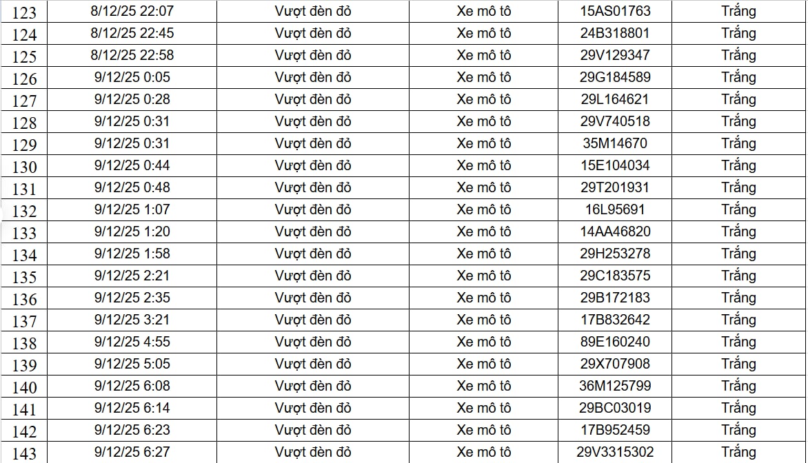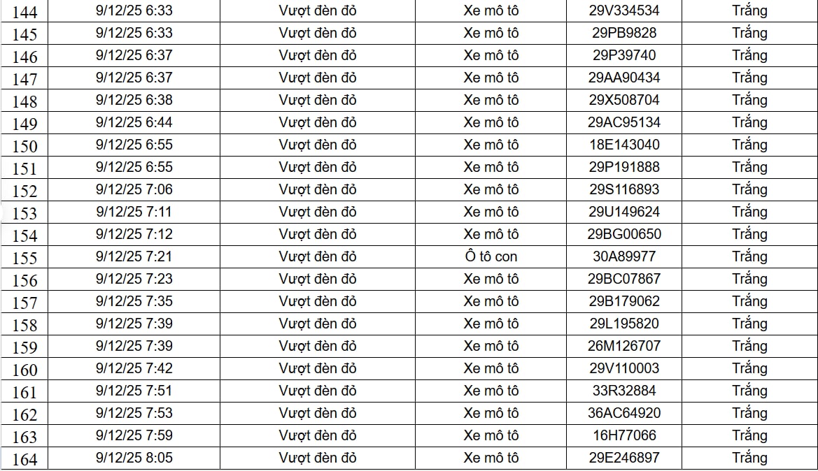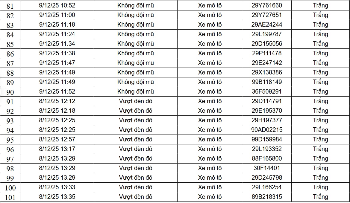 Ngày 9/12, Cục Cảnh sát Giao thông đã công khai 182 trường hợp xe ô tô, xe máy vi phạm trật tự, an toàn giao thông do camera AI phát hiện. Danh sách được ghi nhận từ ngày 8/12 đến ngày 9/12, trên phạm vi cao tốc Nội Bài - Lào Cai và nội đô Hà Nội, với hai lỗi vi phạm là xe mô tô vượt đèn đỏ và xe mô tô không đội mũ bảo hiểm.