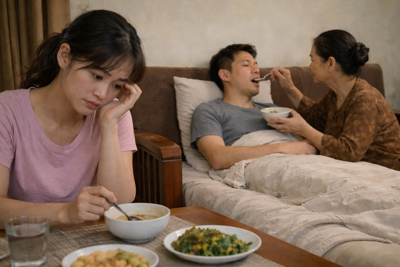Có lần, chồng tôi ốm sốt. Tôi xin nghỉ làm về sớm, lo nấu cháo, lau người cho anh. Mẹ chồng đứng bên, vừa nhìn vừa sốt ruột, rồi nhẹ nhàng nhưng dứt khoát đẩy tôi ra: “Để mẹ làm, con vụng về lắm.” Tôi đứng trong bếp, nước mắt rơi lúc nào không hay. Tôi không giận bà, tôi chỉ tủi thân vì cảm giác mình là người ngoài trong chính cuộc hôn nhân của mình.
