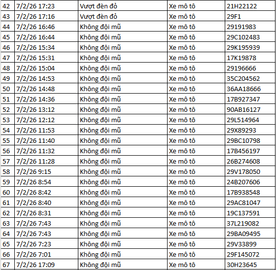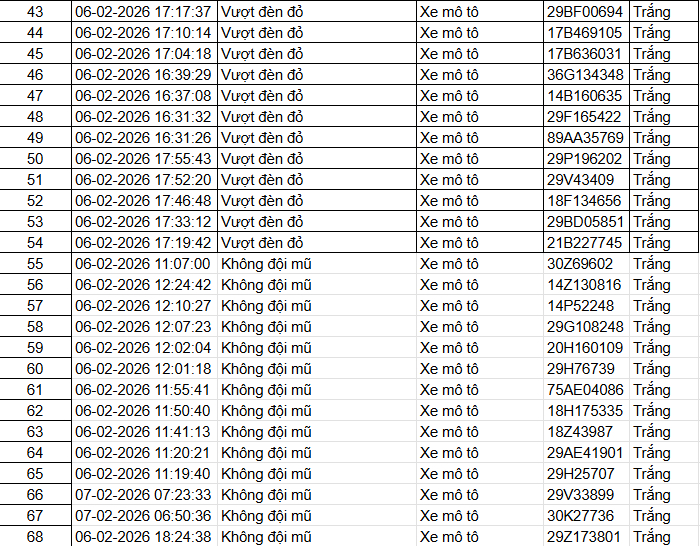 Ngoài ra, Cục Cảnh sát giao thông thông báo, qua trích xuất dữ liệu từ camera A.I được thí điểm lắp đặt tại nội đô Hà Nội, trong 2 ngày cuối tuần 7/2 và 8/2 đã tự động phát hiện: 135 xe máy vi phạm TTATGT tại TP. Hà Nội . Danh sách cụ thể như sau: