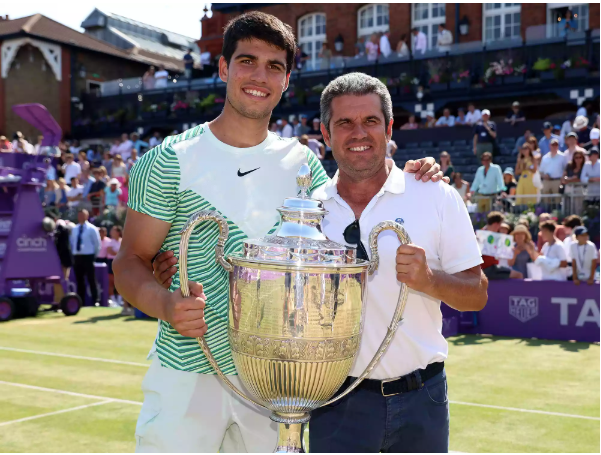Carlos Alcaraz chia vui cùng bố sau chức vô địch Cinch Championships 2023.