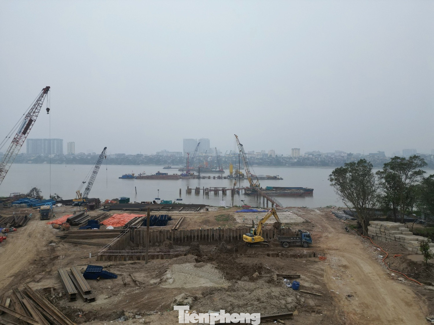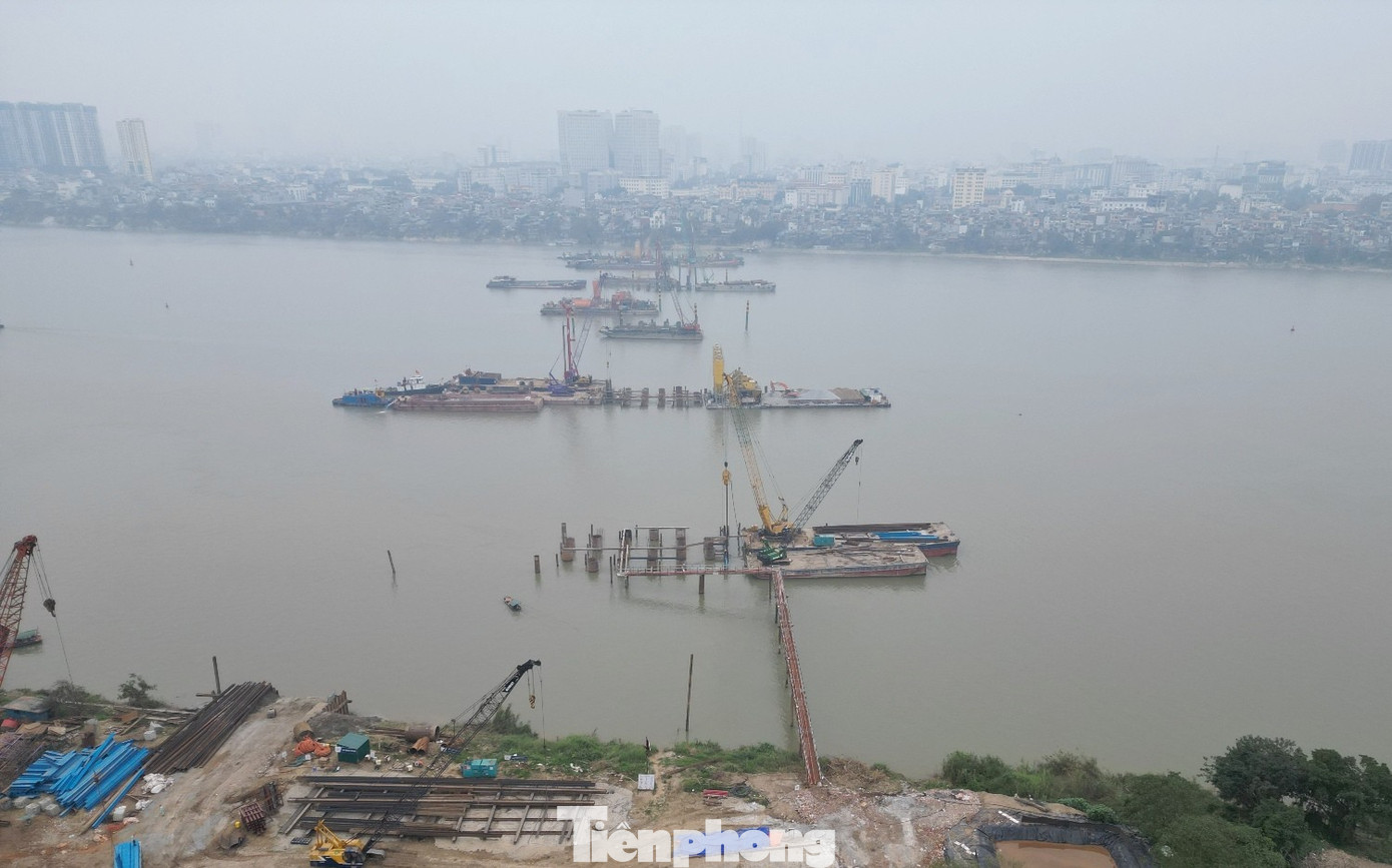 Trao đổi với PV Tiền Phong tại hiện trường dự án vừa qua, ông Nguyễn Duy Nghị - Ban Quản lý dự án cầu Trần Hưng Đạo cho biết, dự án có tổng cộng 7 trụ vượt sông và tính đến ngày 4/2/2026 các nhà thầu đang thi công 6/7 trụ, riêng trụ phía giáp bờ phía phường Hoàn Kiếm chưa thể thi công do vướng mặt bằng.