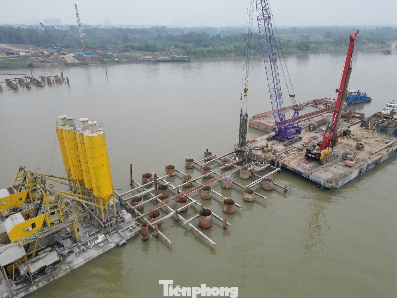 Hiện các nhà thầu đang thi công tổng thể các trụ cầu ở giữa sông, hạng mục thi công là cọc khoan nhồi (chân các trụ cầu cắm ở lòng sông, sâu khoảng 60 mét).