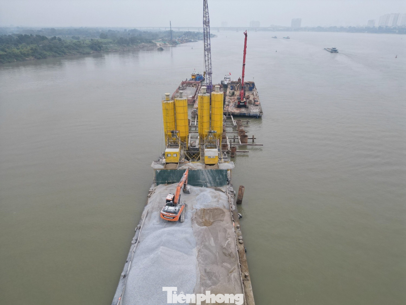 Để chủ động trong việc thi công, không phải chờ vật liệu vận chuyển từ trên bờ, ngoài máy móc, thiết bị, các nhà thầu đã huy động cả vật liệu và trạm trộn bê tông ra lòng sông để thi công cọc khoan nhồi, trụ cầu..