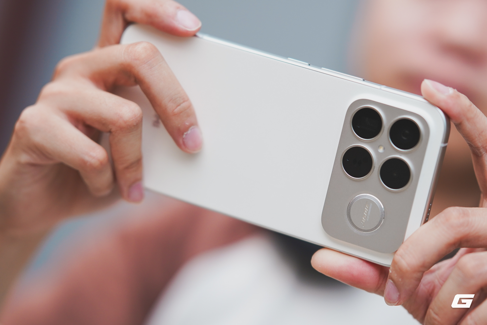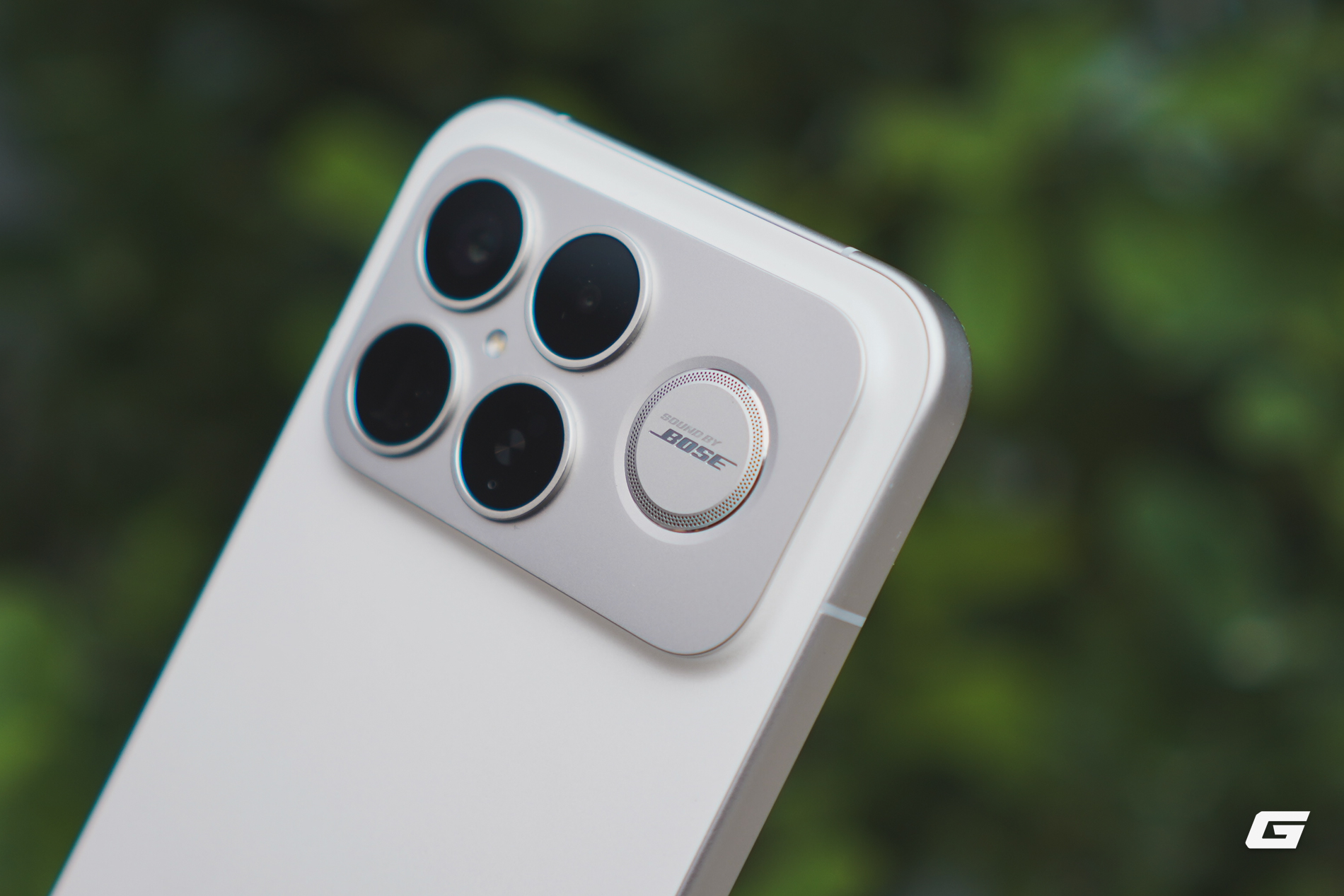 Nổi bật ở mặt lưng này là hệ thống mô-đun camera có kích thước khá lớn, trông thì có vẻ là 4 ống kính nhưng thực chất chỉ gồm 3 ống kính, đèn flash và một hệ thống loa Bose được đặt ở ngay trong mô-đun camera