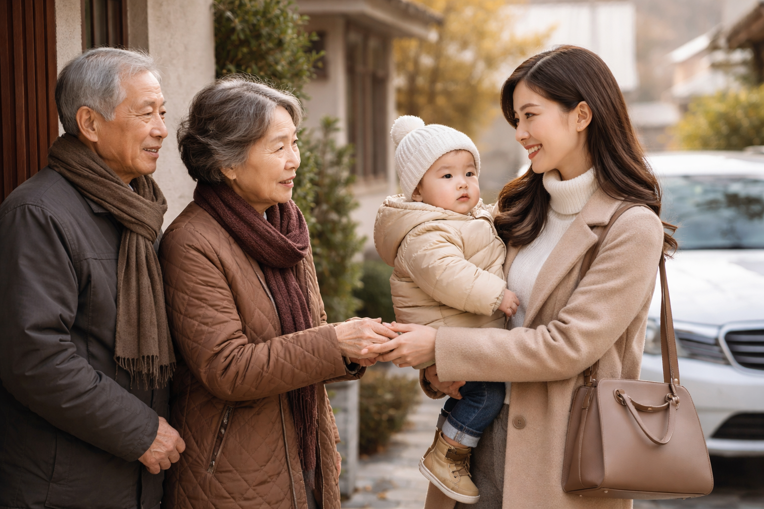 Sáng 27 Tết, cả nhà tôi chất đồ lên xe. Bố mẹ chồng ra tận cổng tiễn. Mẹ chồng tôi năm nay đã ngoài 80, lưng còng hơn trước, tóc bạc gần hết. Bà bế cháu nội trên tay, hôn lên má con bé.