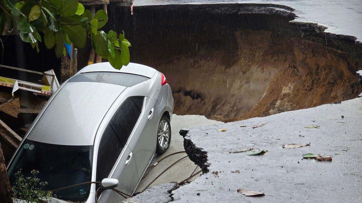 2 xe ô tô nằm chỏng chơ dưới hố, một ô tô khác sụp hai bánh sau, nằm vắt vẻo trên miệng hố.