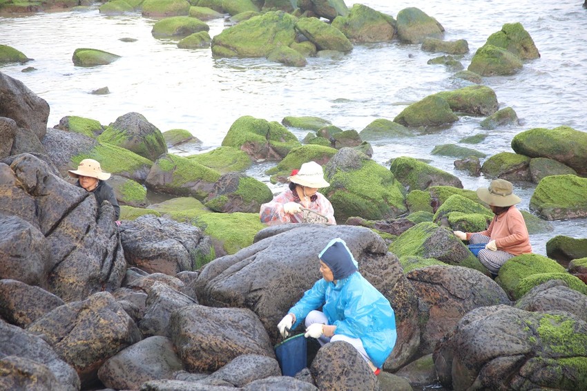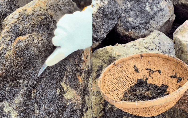 Cái tên "rong mứt" nghe thì ngọt sớt nhưng hành trình thu hoạch nó lại "đắng cay" không hề dễ dàng. Để hái được nắm rong, người dân phải vật lộn với những vách đá trơn như mỡ, sơ sẩy một chút là "ăn trầu" như chơi. Tiktoker Chuyện Thi chia sẻ, dù có trang bị đủ bao tay, dao cạo hay kinh nghiệm đầy mình thì việc thu hoạch vẫn cực kỳ tốn công vì rong bám rất lì. Có khi đứng phơi mình giữa gió rét và sóng tạt suốt 2 tiếng đồng hồ, thành quả thu về cũng chỉ vừa đủ một bữa cơm gia đình.