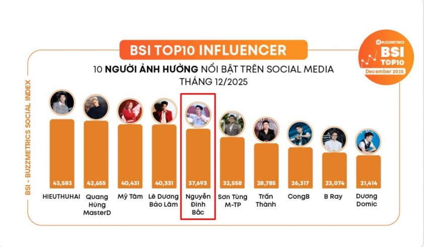 Nguyễn Đình Bắc, tiền đạo trẻ của U23 Việt Nam, tiếp tục tạo dấu ấn đặc biệt không chỉ trên sân cỏ mà còn trên không gian mạng khi được xếp hạng thứ 5 trong danh sách 10 nhân vật có ảnh hưởng lớn nhất trên mạng xã hội tháng 12/2025 do BuzzMetrics công bố. Điều đáng chú ý là bảng xếp hạng này vốn thường xuyên thuộc về các nghệ sĩ giải trí đình đám, nhưng Đình Bắc lại vượt qua hàng loạt tên tuổi lớn như Sơn Tùng M-TP, Trấn Thành, B Ray, Dương Domic hay Negav.