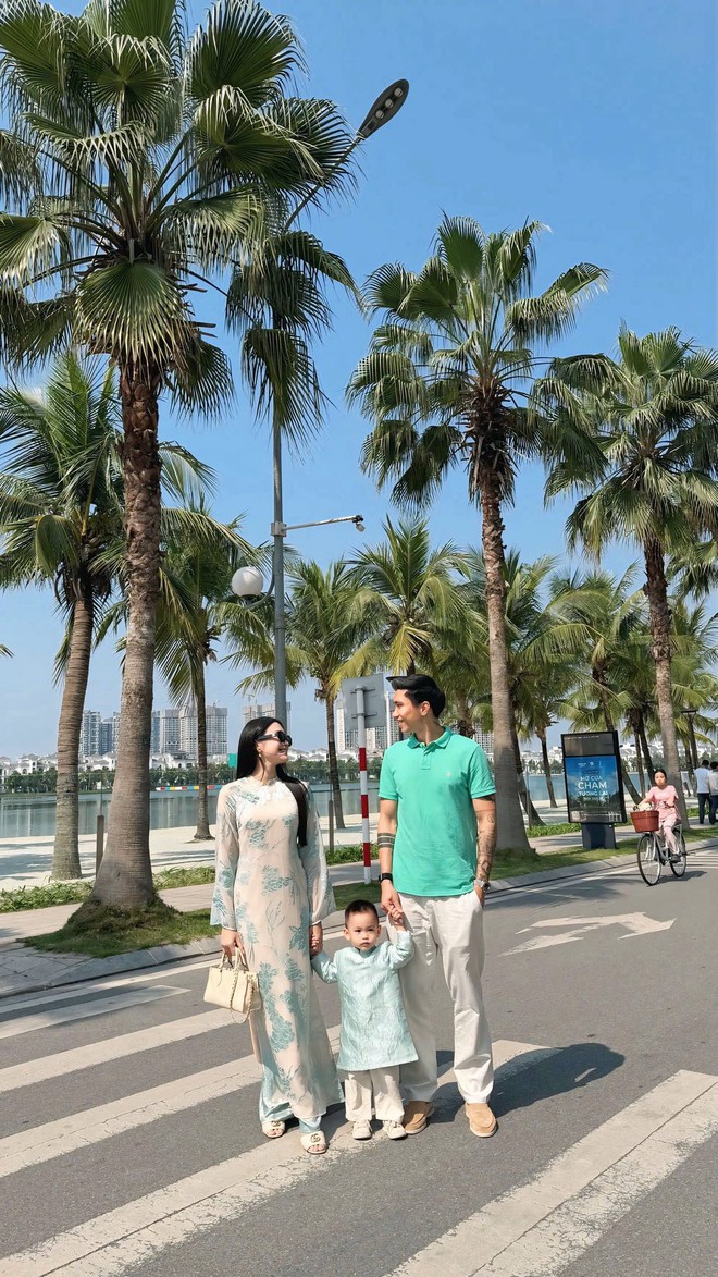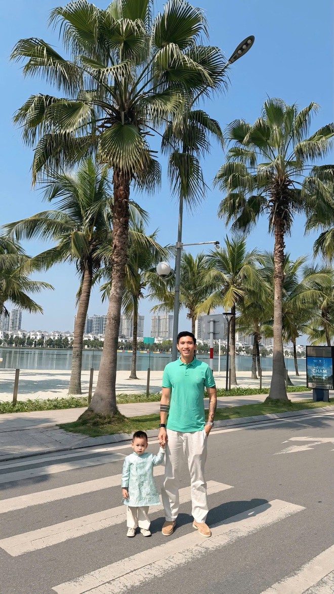 Sánh đôi bên cạnh, Văn Hậu chọn outfit đơn giản với áo polo xanh và quần sáng màu, cao lớn nổi bật. Cặp đôi nắm tay con trai dạo phố, cả nhà diện đồ tone-sur-tone tạo nên khung hình gia đình chuẩn "visual cực phẩm" khiến ai đi ngang cũng phải ngoái nhìn. Đặc biệt, khoảnh khắc Hải My được ông xã bế con đứng cạnh tươi cười càng làm nổi bật hình ảnh tổ ấm hạnh phúc, viên mãn.