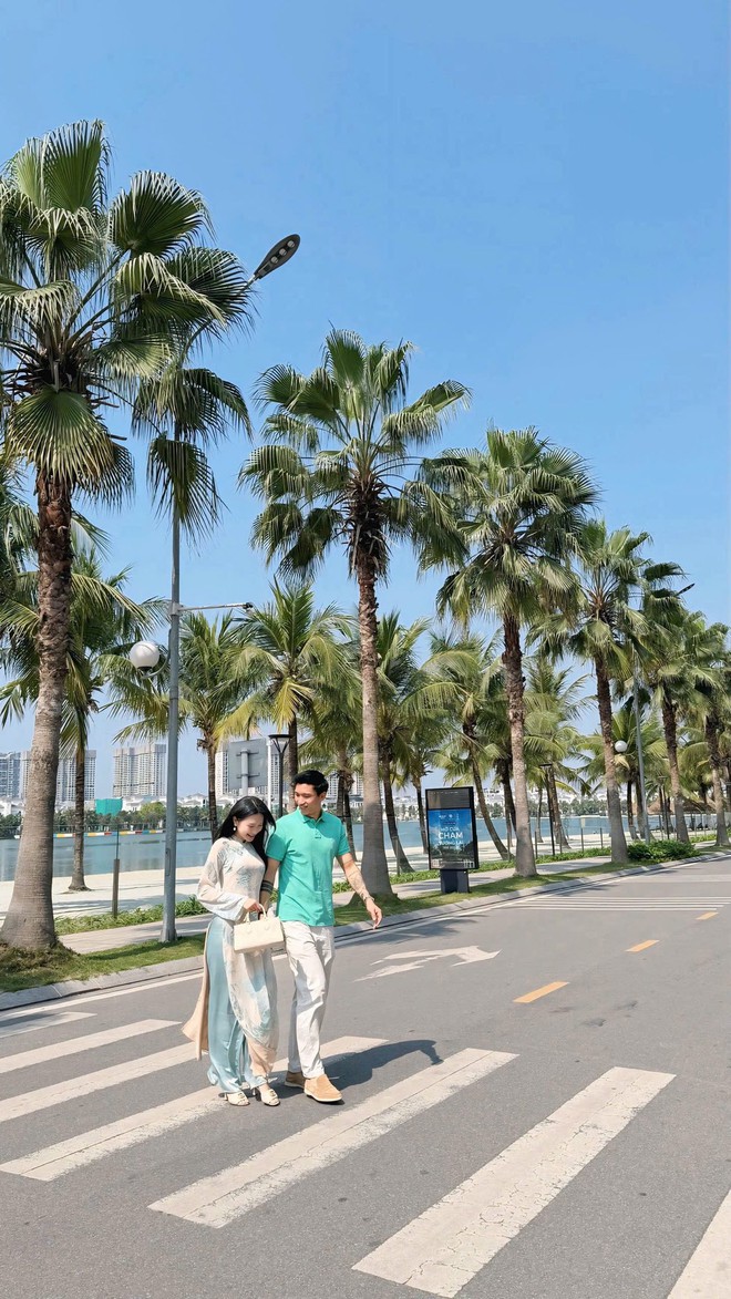 Trong loạt ảnh du xuân cùng ông xã Đoàn Văn Hậu và con trai nhỏ, Doãn Hải My diện áo dài nền kem điểm họa tiết xanh ngọc dịu mắt, thiết kế ôm nhẹ tôn vóc dáng thanh mảnh. Visual "nàng thơ" với mái tóc đen dài buông xõa, lối trang điểm trong trẻo giúp cô ghi điểm tuyệt đối giữa khung cảnh nắng xuân rực rỡ bên hàng dừa và mặt hồ xanh mát.