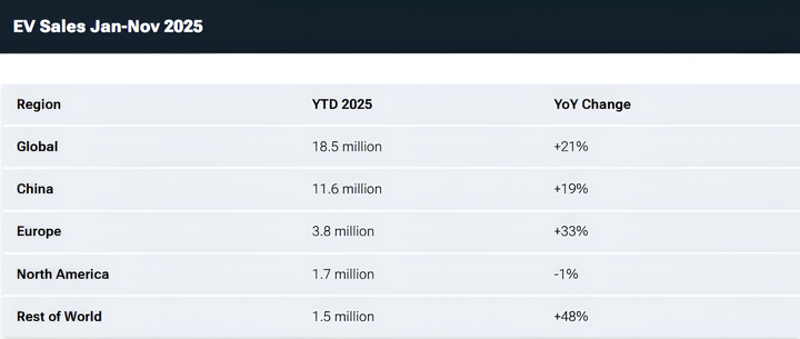 Không nằm ngoài dự đoán, Trung Quốc vẫn là thị trường xe điện lớn nhất thế giới. Trong 11 tháng đầu năm 2025, quốc gia này ghi nhận 11,6 triệu xe EV và PHEV được bán ra, tăng 19% so với cùng kỳ năm ngoái.