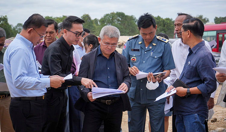 Chea Vuthy - Tổng Thư ký Ủy ban Đầu tư Campuchia thuộc Hội đồng Phát triển Campuchia (giữa) - trong chuyến thị sát dự án cảng cạn tại xã Krabao, huyện Kamchay Mear, tỉnh Prey Veng, Campuchia, hồi tuần trước. Ảnh: CDC