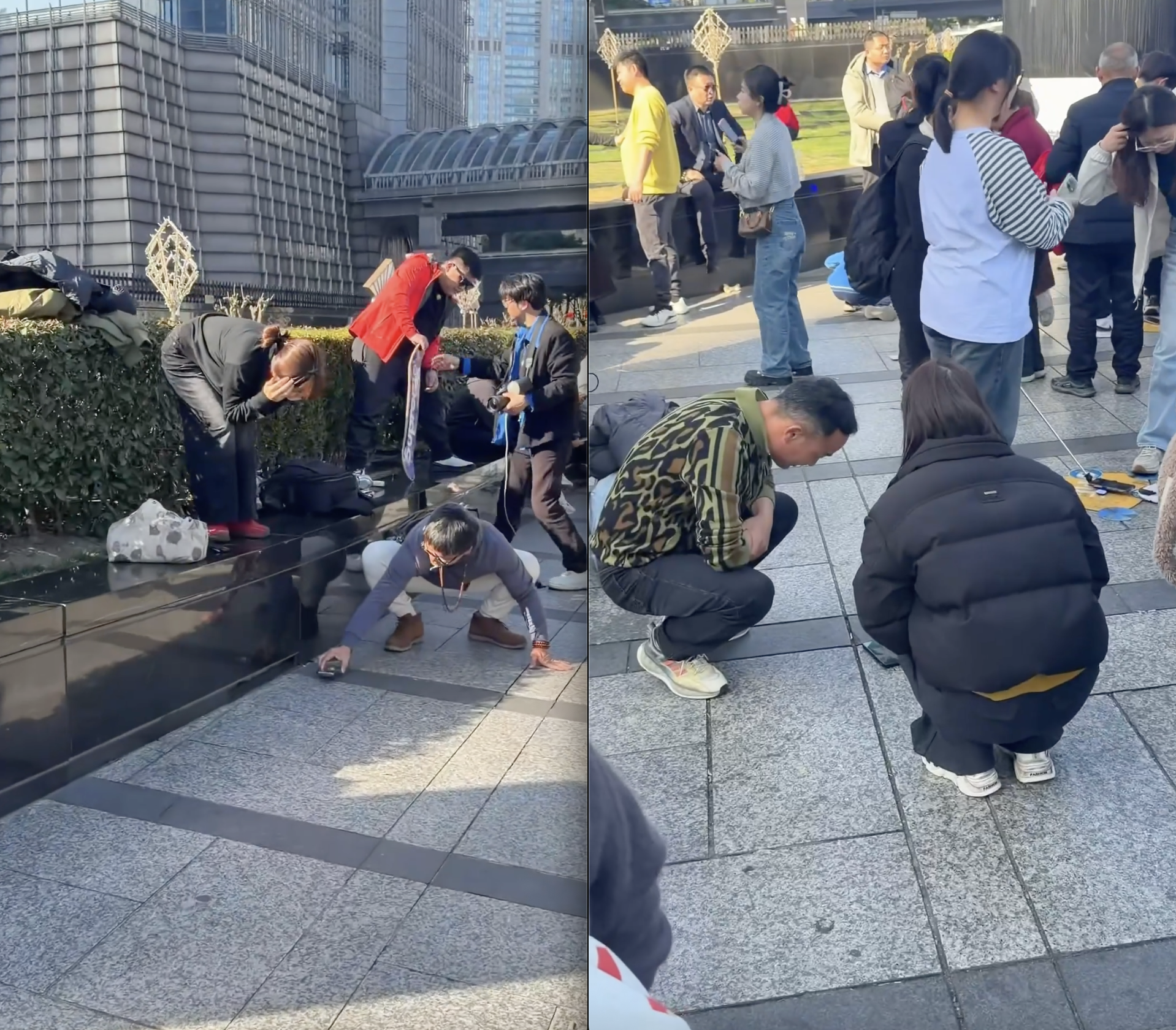 Cảnh tượng này khiến Vĩnh không khỏi thắc mắc. Anh bật cười chia sẻ: "Đi du lịch sao bỏ điện thoại xuống đất hết vậy ta!?" Với những ai lần đầu nhìn thấy, hành động ấy quả thật vừa lạ lẫm, vừa có chút hài hước. Giữa không gian hiện đại, những tòa nhà cao tầng bao quanh, hàng chục chiếc điện thoại nằm la liệt trên nền đất tạo nên khung cảnh khó hiểu.