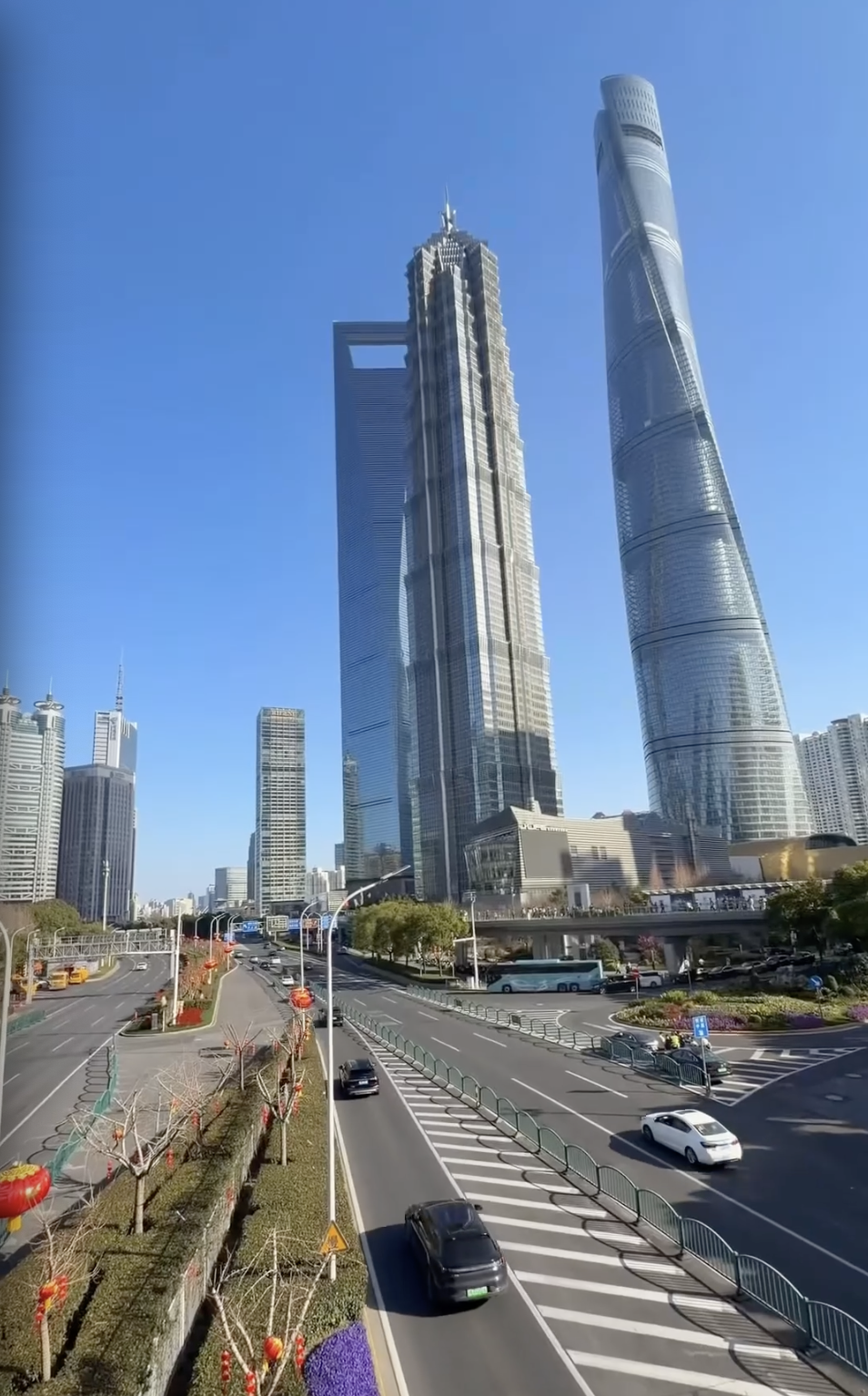 Chủ thể chính trong những bức ảnh này là cụm nhà chọc trời nổi tiếng Lujiazui, gồm Shanghai Tower (Tháp Thượng Hải), Jin Mao Tower (Tháp Kim Mậu) và Shanghai World Financial Center (Trung tâm Tài chính Thế giới Thượng Hải). Bộ ba công trình này nổi bật trên nền trời xanh trong vắt, được xem là biểu tượng cho sự thịnh vượng và nhịp sống sôi động của thành phố.