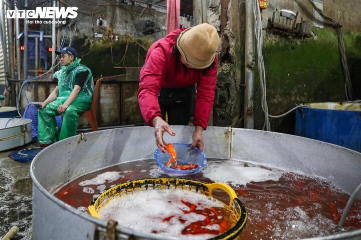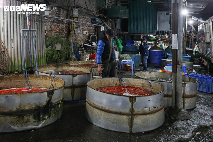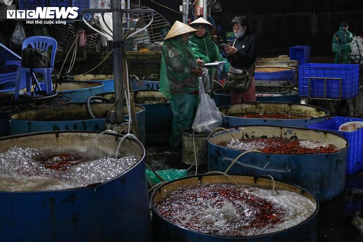 Khoảng 1 tuần gần đây, tại chợ cá Yên Sở, cá chép đỏ - mặt hàng phục vụ lễ cúng ông Công ông Táo theo quan niệm dân gian - được thương lái nhiều nơi đổ về thu mua.