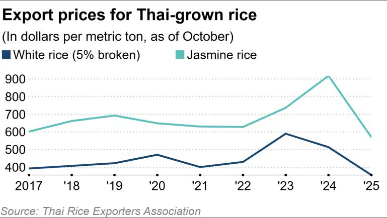 Giá gạo giảm mạnh đang khiến nông dân Thái Lan chuyển hướng tìm kiếm cơ hội tại Nhật Bản — nơi giá gạo bán lẻ tăng mạnh và nhu cầu đối với các giống gạo châu Á ngày càng rõ nét. Một số hộ trồng lúa Thái thậm chí đã bắt đầu thử nghiệm các giống gạo Nhật Bản chất lượng cao như koshihikari để đáp ứng thị hiếu tiêu dùng đặc thù.
