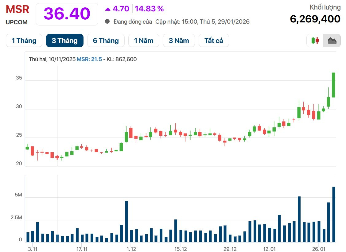 Phiên giao dịch ngày 29/1, cổ phiếu MSR của Công ty cổ phần Masan High-Tech Materials đã tăng trần (14,8%) đóng cửa ở mức giá 36.400 đồng/cp. Tính từ đầu năm 2026 đến nay, cổ phiếu MSR đã tăng gần 48%.