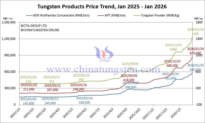 Theo Reuter, giá vonfram đã tăng vọt lên mức cao kỷ lục trong tháng 1, do nguồn cung thắt chặt, các biện pháp kiểm soát xuất khẩu của Trung Quốc và nhu cầu công nghiệp, khiến người tiêu dùng phải tranh giành nguồn cung trong một thị trường vốn đã khan hiếm.