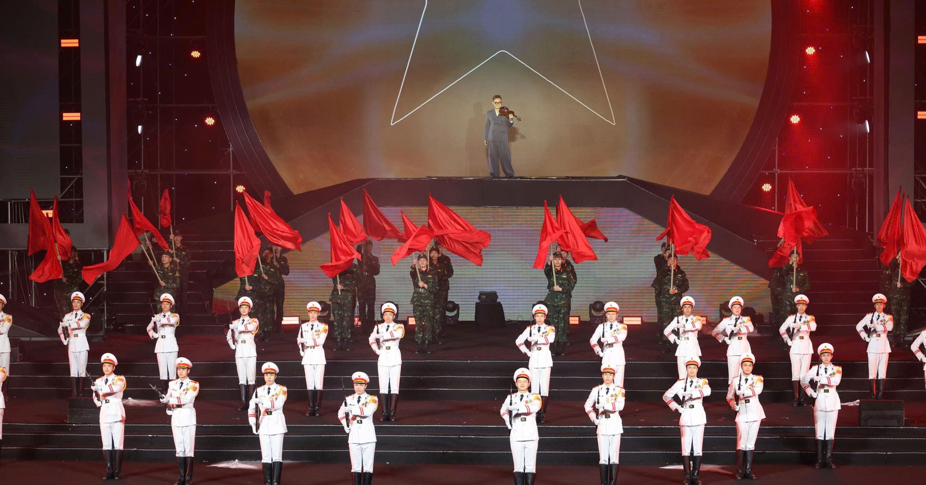 Đại cảnh đồng diễn ‘Sức mạnh Việt Nam’ bao gồm trình diễn múa súng, đồng diễn võ thuật của đặc công phô diễn sức mạnh tổng hợp, chính quy, tinh nhuệ, hiện đại của quân đội, làm mãn nhãn 6.000 khán giả.