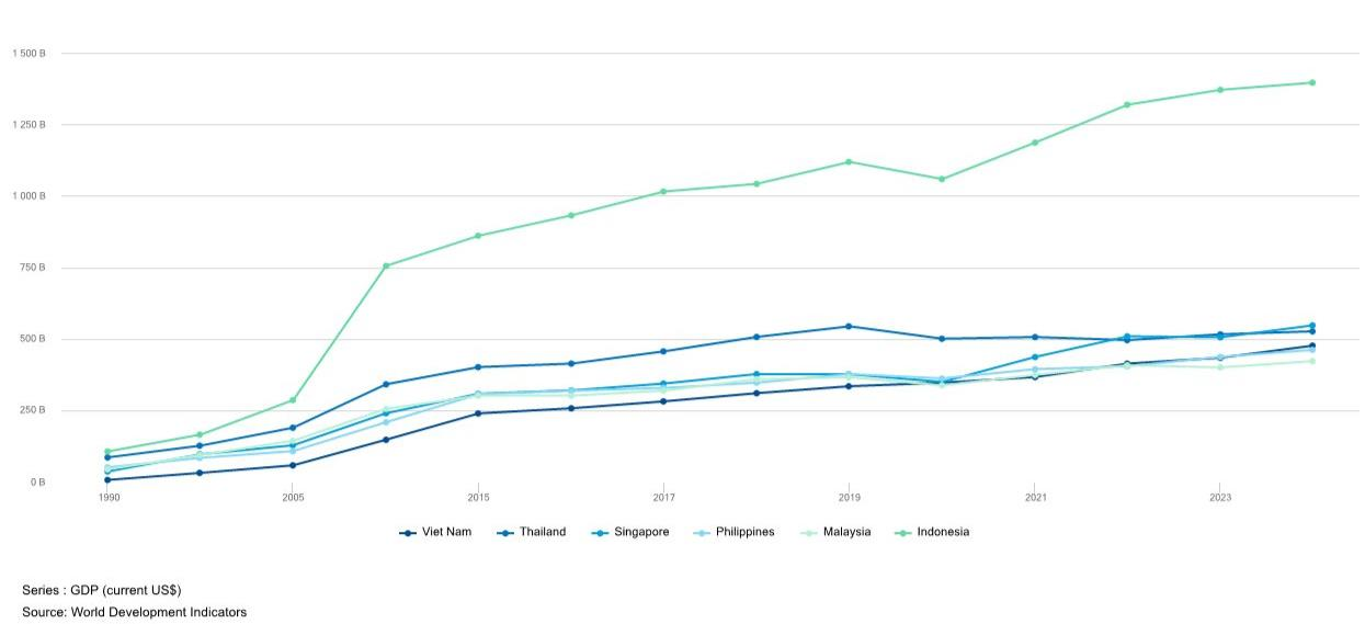 Tuy nhiên, đến năm 2024, với GDP đạt 476,3 tỷ USD, quy mô GDP Việt Nam đã vượt Malaysia (gấp 1,13 lần) và Philippines (gấp 1,03 lần), thu hẹp khoảng cách với các nước còn lại. Cụ thể, GDP của Indonesia chỉ còn gấp 2,93 lần quy mô GDP của Việt Nam; Thái Lan gấp 1,11 lần; Singapore gấp 1,15 lần...