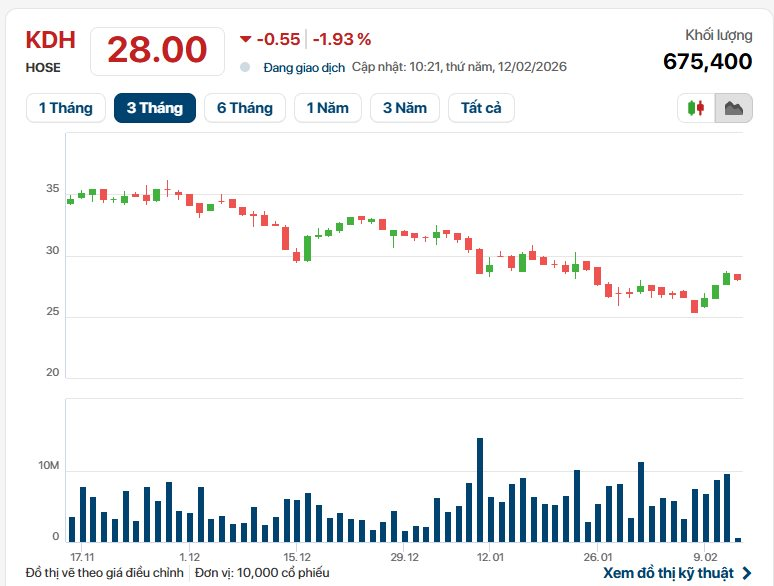 Trên thị trường chứng khoán, ở phiên sáng 12/02, cổ phiếu KDH giao dịch ở mức 28.000 đồng/cổ phiếu, giảm 1,93% so với tham chiếu, khối lượng cổ phiếu giao dịch khớp lệnh đạt gần 700 nghìn đơn vị.