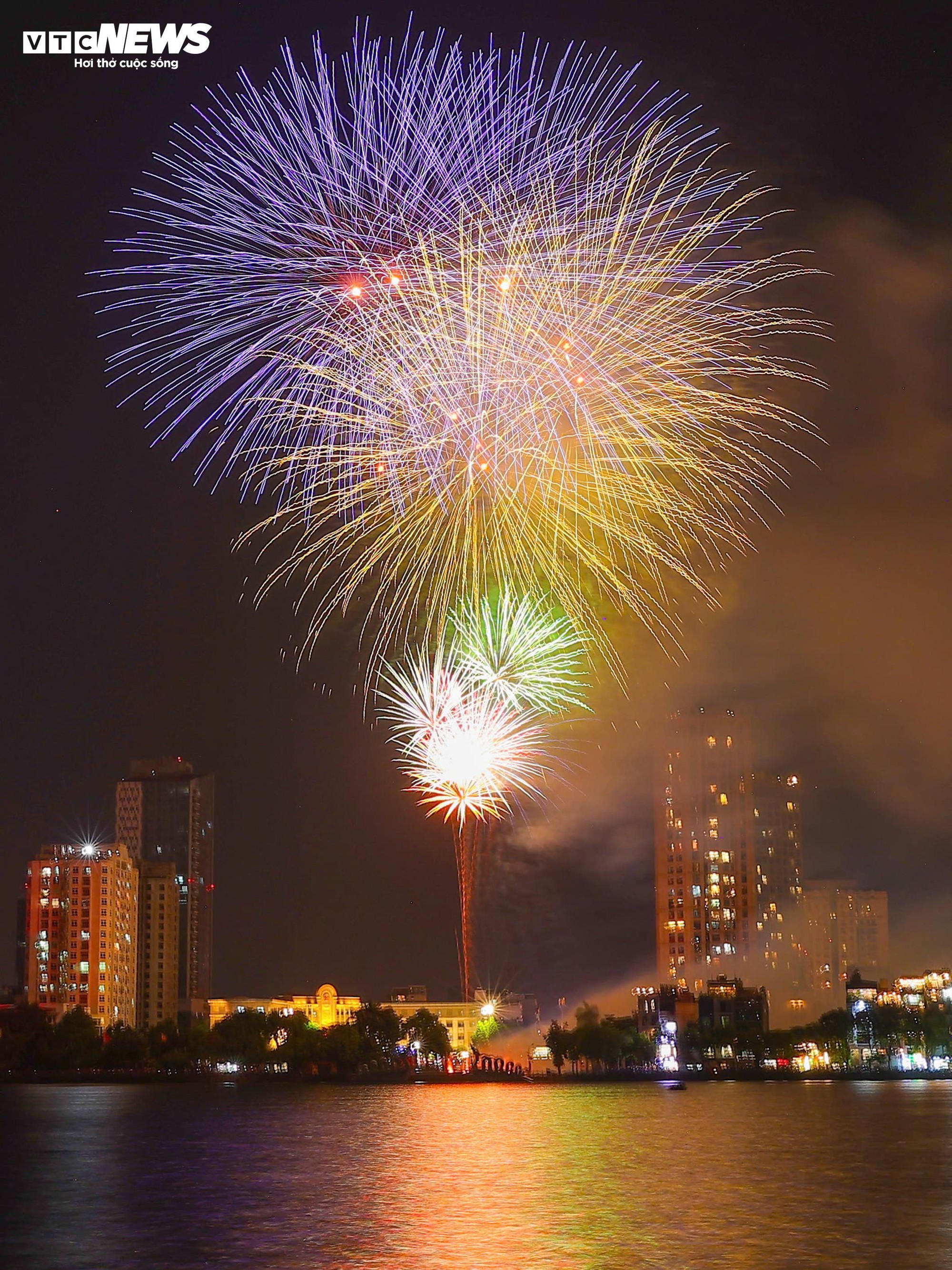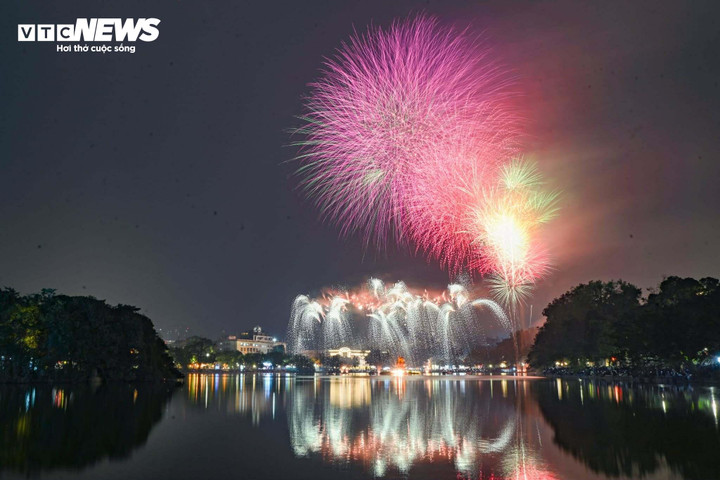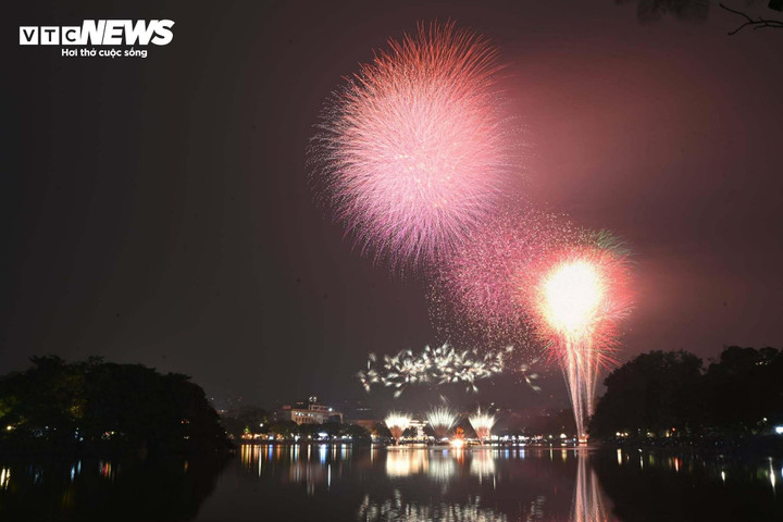 Tại khu vực phố đi bộ hồ Gươm (phường Hoàn Kiếm), những chùm pháo hoa liên tiếp được bắn lên, tạo nên khung cảnh lung linh trên bầu trời Hà Nội.