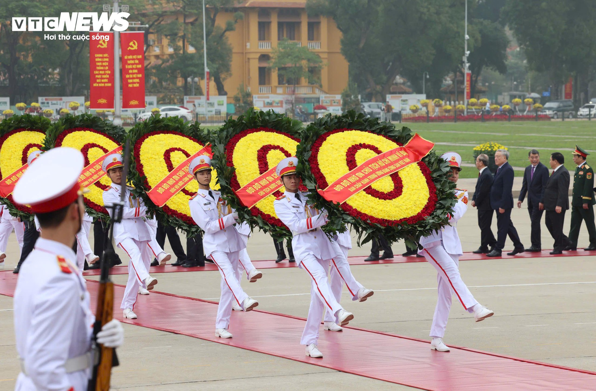 Dự lễ viếng có Tổng Bí thư Tô Lâm, Chủ tịch nước Lương Cường, Thủ tướng Phạm Minh Chính, Chủ tịch Quốc hội Trần Thanh Mẫn, Thường trực Ban Bí thư Trần Cẩm Tú.