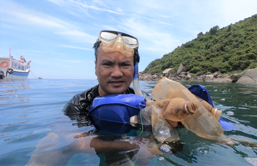 Anh Trung Đào khi lặn biển nhặt rác vào năm 2019 (Ảnh: Hà Nam)