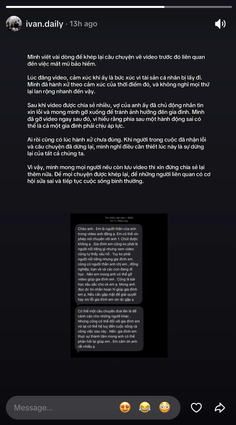 Video sau đó lan truyền trên TikTok, thu hút nhiều bình luận. Tuy nhiên, tài khoản đăng tải đã gỡ clip. Trong một story được chia sẻ sau đó, chủ tài khoản cho biết khi đăng video, anh bức xúc vì tài sản cá nhân bị lấy đi và không nghĩ câu chuyện lan rộng nhanh như vậy. Anh cho biết vợ của người trong video đã chủ động nhắn tin xin lỗi, mong gỡ video để tránh ảnh hưởng đến gia đình. Người đăng nhận thấy phía sau một hành động sai có thể là cả gia đình chịu áp lực nên đã gỡ nội dung và đề nghị cộng đồng không chia sẻ lại.