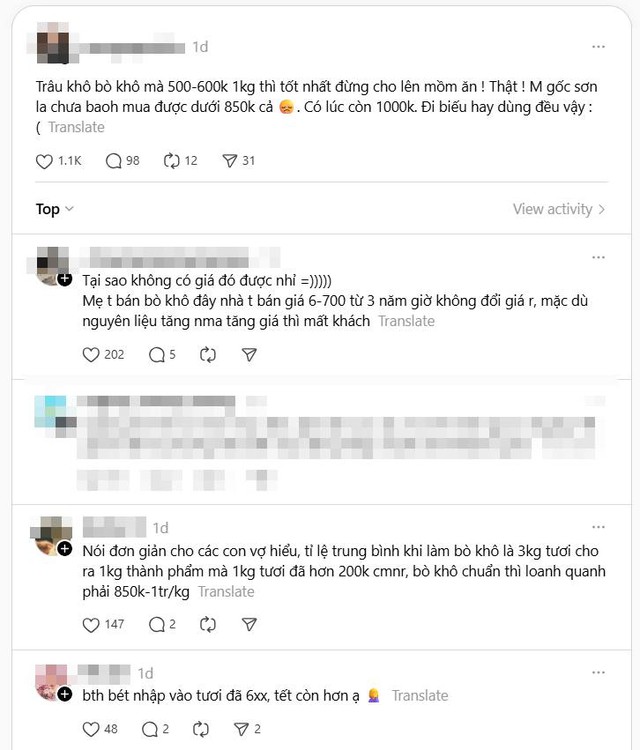 Ngay cả những người thường làm thịt bò khô cho gia đình chứ không buôn bán gì cũng phải thốt lên: "Lấy đâu bò khô, trâu khô hay gác bếp giá rẻ thế, có mà thịt lợn thì đúng hơn".
