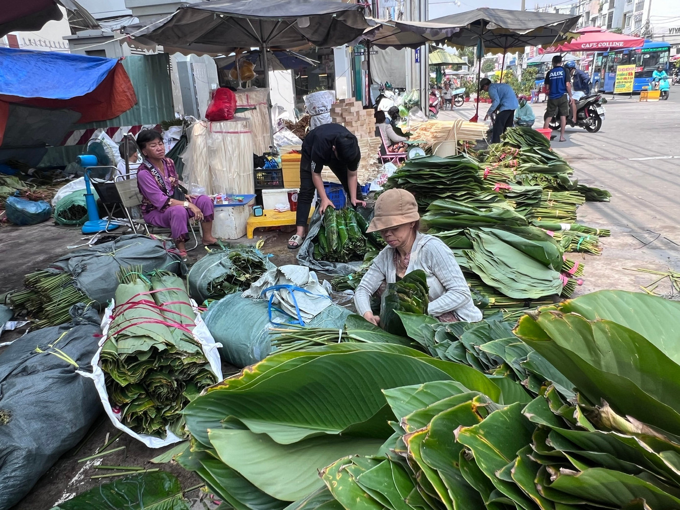Ngày 13/2, chợ lá dong nằm trên đường Cách Mạng Tháng Tám (phường Bảy Hiền, TPHCM) gần như chỉ có người bán, vắng hẳn người mua. "Trước đây, sau rằm tháng Chạp, chợ đã nhộn nhịp ngày đêm, nhưng giờ đã 25-26 tháng Chạp rồi mà vẫn ế ẩm; khách đến thưa thớt và chỉ mua số lượng nhỏ" - một tiểu thương bán lá dong cho biết.
