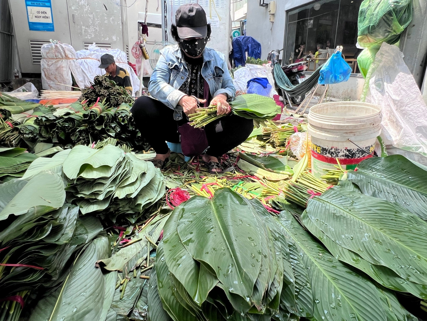 Lá dong được thu mua từ Đồng Nai, Lâm Đồng; lá chuối chủ yếu từ các tỉnh miền Tây, vận chuyển về trong ngày để đảm bảo độ tươi. Trong thời gian chờ khách, tiểu thương cắt xén để lá đẹp hơn, tưới nước để lá không bị héo.
