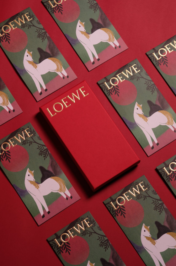 Tinh thần “whimsical” của LOEWE nổi bật với thiết kế bao lì xì lấy cảm hứng từ câu chuyện “Chú ngựa nhỏ qua sông” - một tác phẩm hợp tác cùng nghệ sĩ Bành Văn Tây. Câu chuyện mang theo những lời nhắn nhủ ý nghĩa, truyền cảm hứng với thông điệp về sự tự tin và lòng dũng cảm, không ngại tiến bước trong năm mới.
