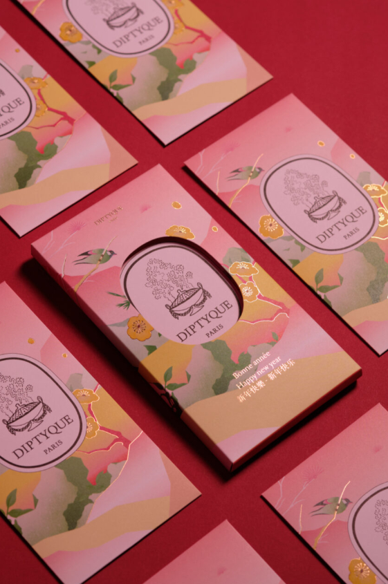Không chọn đỏ làm tông sắc chủ đạo, Diptyque chọn những gam sắc đầu mùa như muốn vẽ nên trời xuân của hương sắc và thi ca. Những họa tiết thiên nhiên, gam màu pastel và ánh kim tinh tế hòa quyện, mở ra thế giới mộng mơ – nơi từng phong bao trở thành một mảnh thơ chúc năm mới an lành.