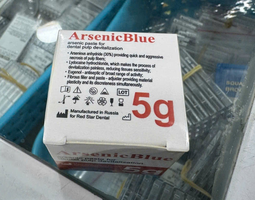 Tại đây, lực lượng chức năng phát hiện cơ sở đang bày bán các sản phẩm “Arsenic Blue 5g” và “Pâte Nécronerve” (chất diệt tủy trong nha khoa) nhưng không có hóa đơn, chứng từ chứng minh nguồn gốc hợp pháp.