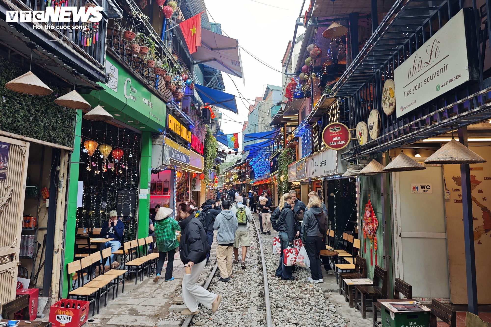 Sau nhiều năm tồn tại tự phát và từng đối mặt nguy cơ bị dẹp bỏ để bảo đảm an toàn đường sắt, phố cà phê đường tàu ở Hà Nội (khu vực ven đường tàu đi qua các phố Lê Duẩn, Khâm Thiên, Trần Phú, Phùng Hưng) vẫn tấp nập khách những ngày cận Tết. Dòng du khách, đặc biệt là người nước ngoài, đổ về đông đúc bất chấp những cảnh báo rủi ro.