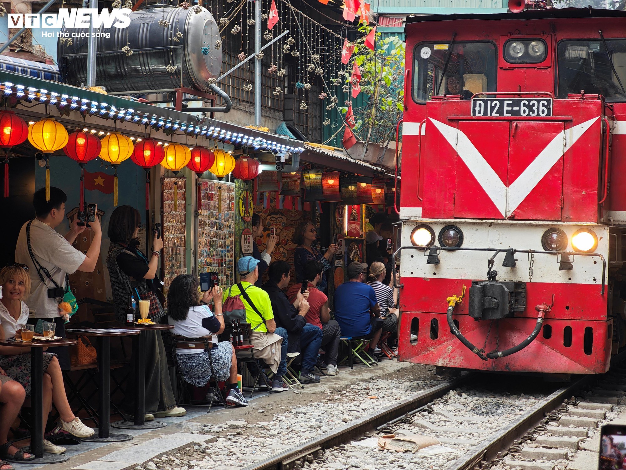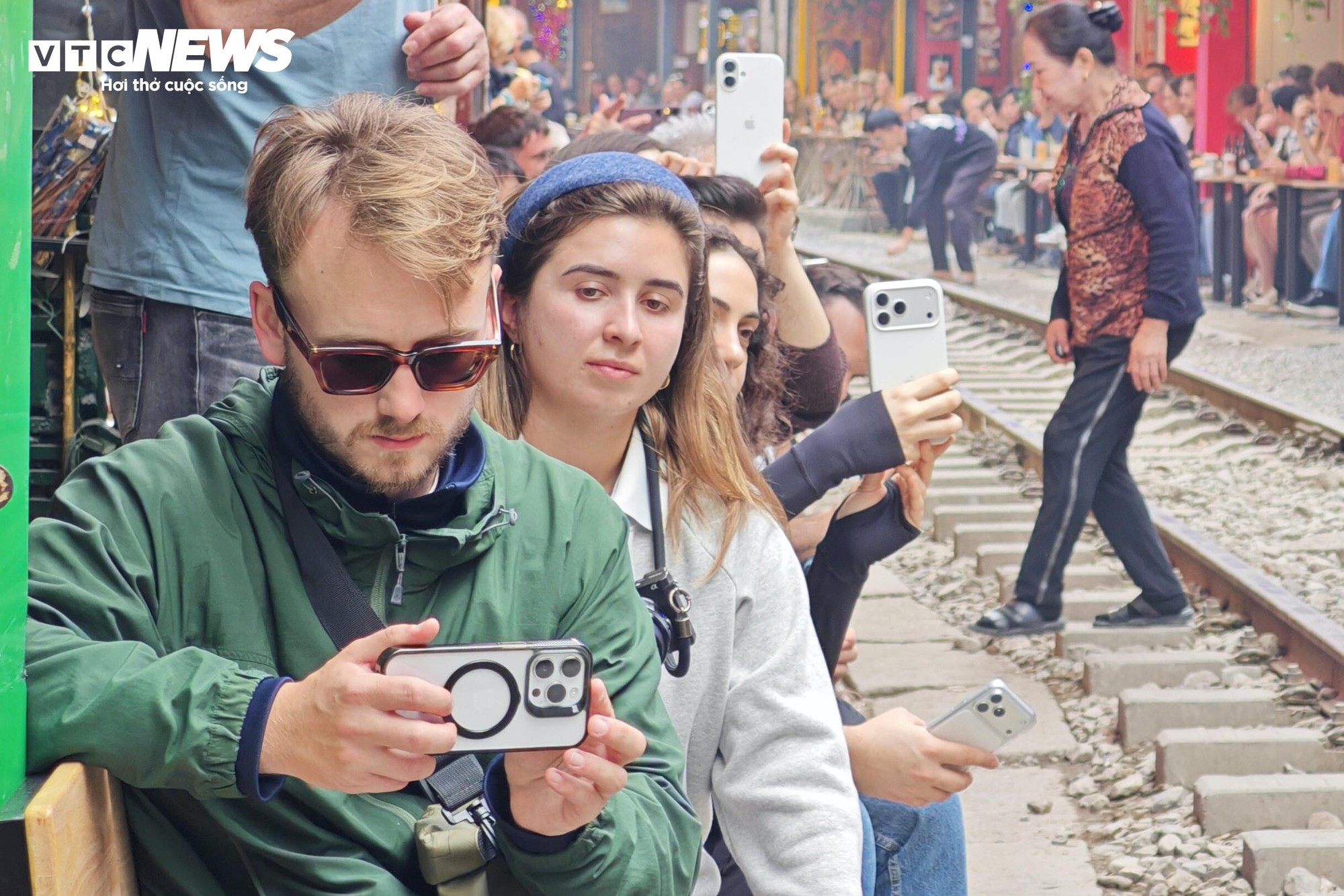Lúc 15h, trước thời điểm tàu chạy qua khoảng 20 phút, khu vực lối vào phố cà phê đường tàu đã đông kín du khách. Trong không gian hẹp dọc hai bên đường ray, nhiều ngôn ngữ như Anh, Pháp, Hàn vang lên xen lẫn tiếng mời chào của các chủ quán.