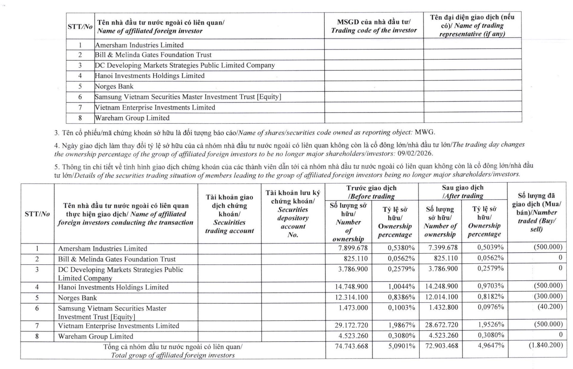Theo báo cáo gửi Ủy ban Chứng khoán Nhà nước và Sở Giao dịch Chứng khoán TP.HCM (HOSE), nhóm nhà đầu tư nước ngoài liên quan đến Dragon Capital và quỹ đầu tư của tỷ phú Bill Gates đã bán ra tổng cộng 1.840.200 cổ phiếu MWG của Công ty Cổ phần Đầu tư Thế Giới Di Động trong ngày 09/02 và chính thức không còn là cổ đông lớn.