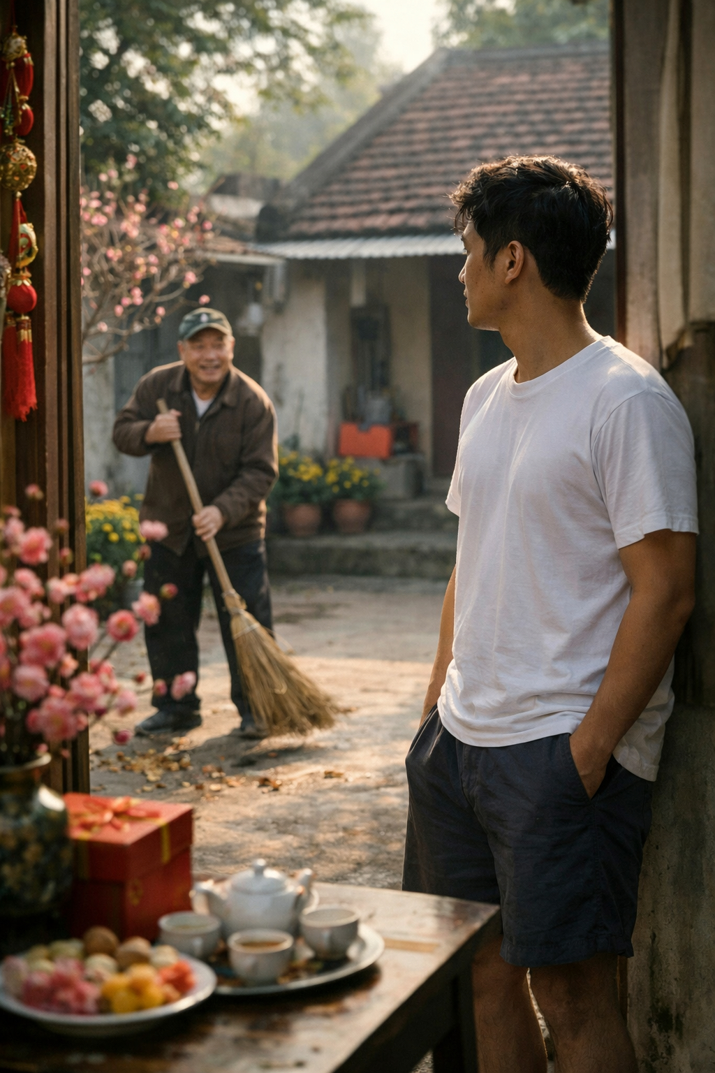 Tôi quay vào nhà, định pha ấm trà cho tỉnh táo. Trong phòng khách, bố mẹ đang chuẩn bị bánh kẹo để lát nữa đón khách đến chúc Tết. Mẹ nhìn tôi, chỉ hỏi đơn giản: “Ra ngoài hít gió năm mới thấy dễ chịu không con?”