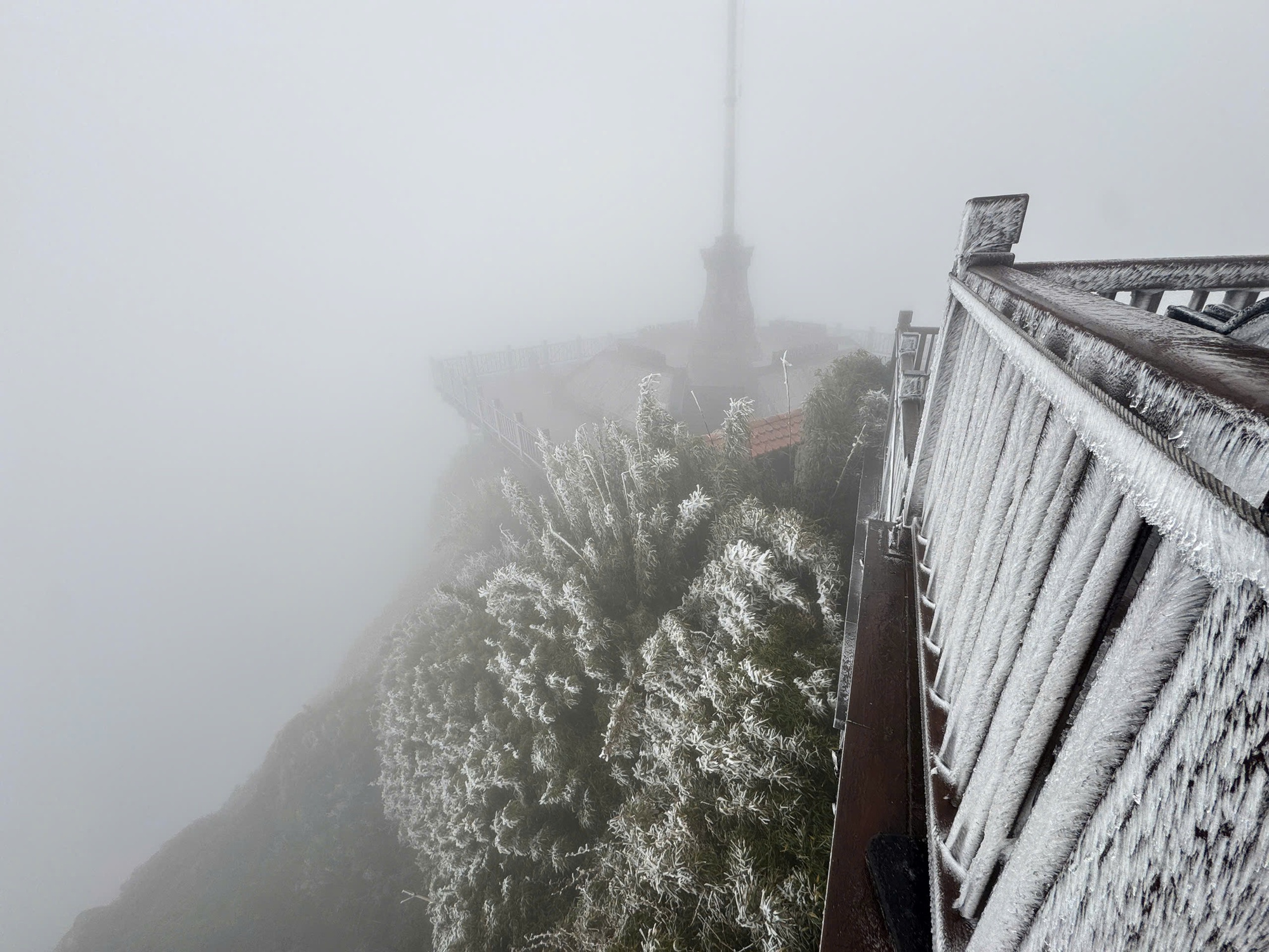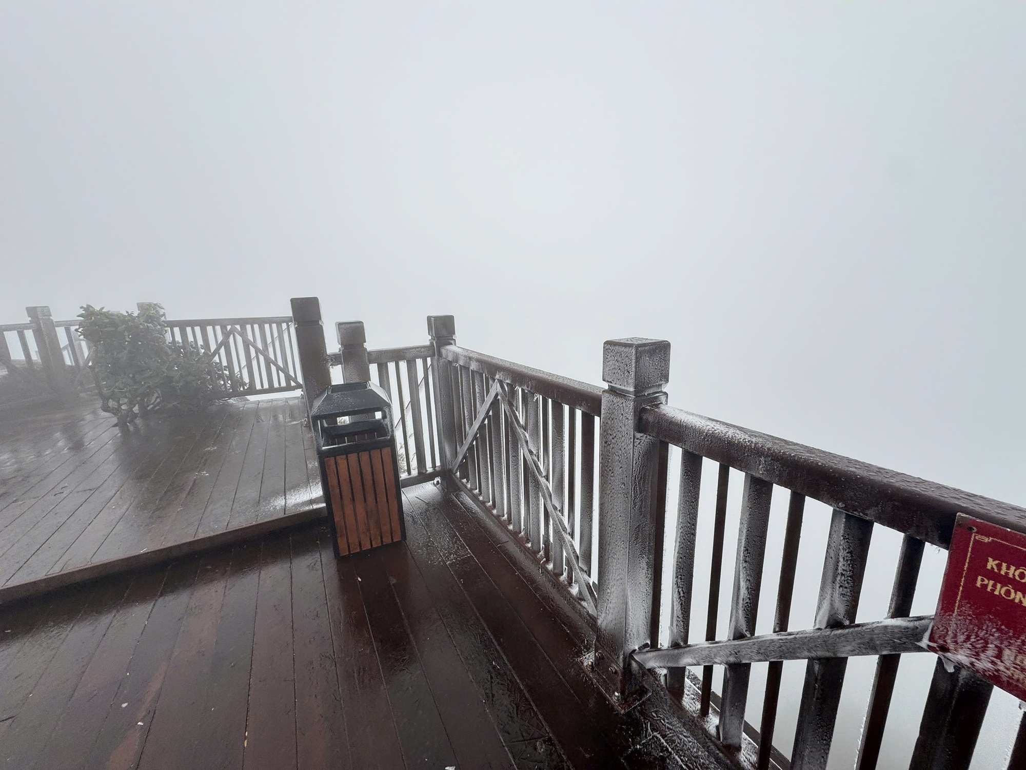 Cụ thể, vào khoảng 6h sáng, nhiệt độ tại khu vực này được ghi nhận chỉ còn -3 độ C. Cái lạnh buốt bao trùm khiến băng giá xuất hiện dày đặc, phủ trắng cây cối, lối đi, lan can và nhiều công trình trên đỉnh núi. Khung cảnh hiện ra như một bức tranh mùa đông châu Âu, khác hẳn với hình dung quen thuộc về khí hậu nhiệt đới của Việt Nam.
