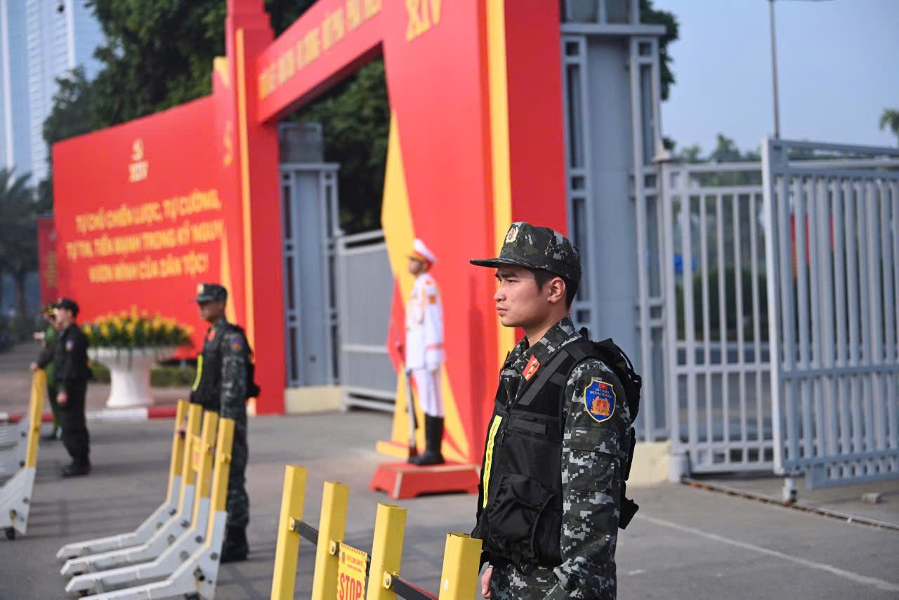 9 giờ, tại Trung tâm Hội nghị Quốc gia, lực lượng Đặc nhiệm triển khai đội hình, phương tiện và các thiết bị quan sát từ xa xung quanh mục tiêu bảo vệ. Mọi phương án đều được tính toán kỹ lưỡng, nhằm phát hiện sớm, áp chế và vô hiệu hóa kịp thời mọi nguy cơ có thể đe dọa an ninh, an toàn Đại hội. Cùng thời điểm, các tổ Cảnh vệ đồng loạt vào vị trí, tổ chức kiểm soát nghiêm ngặt tại các cổng ra vào khu vực bảo vệ.