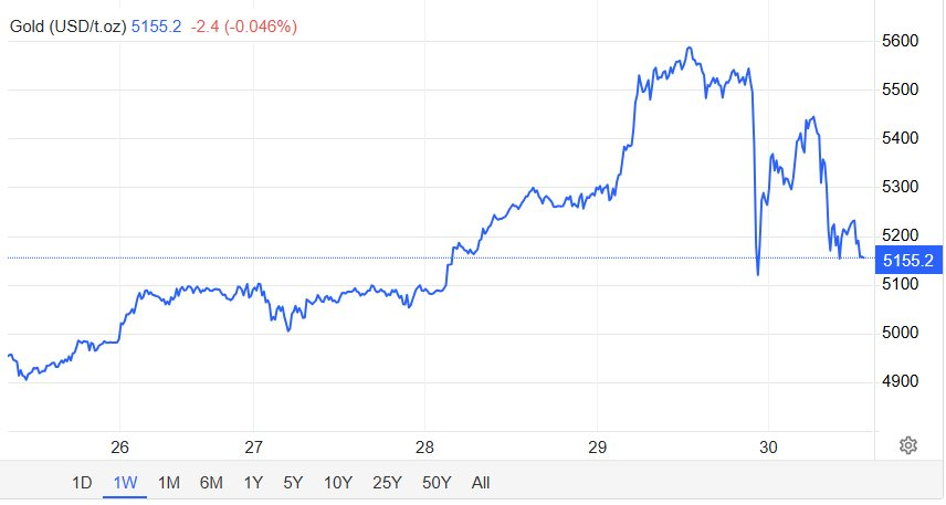 Chốt phiên giao dịch 29/1 (giờ Mỹ), giá vàng thế giới giao ngay giảm 34,6 USD xuống còn 5.379 USD/ounce. Trong khi đó, hợp đồng vàng tương lai giao tháng 2 tại Mỹ chốt phiên giảm 0,3% xuống 5.318,4 USD/ounce.