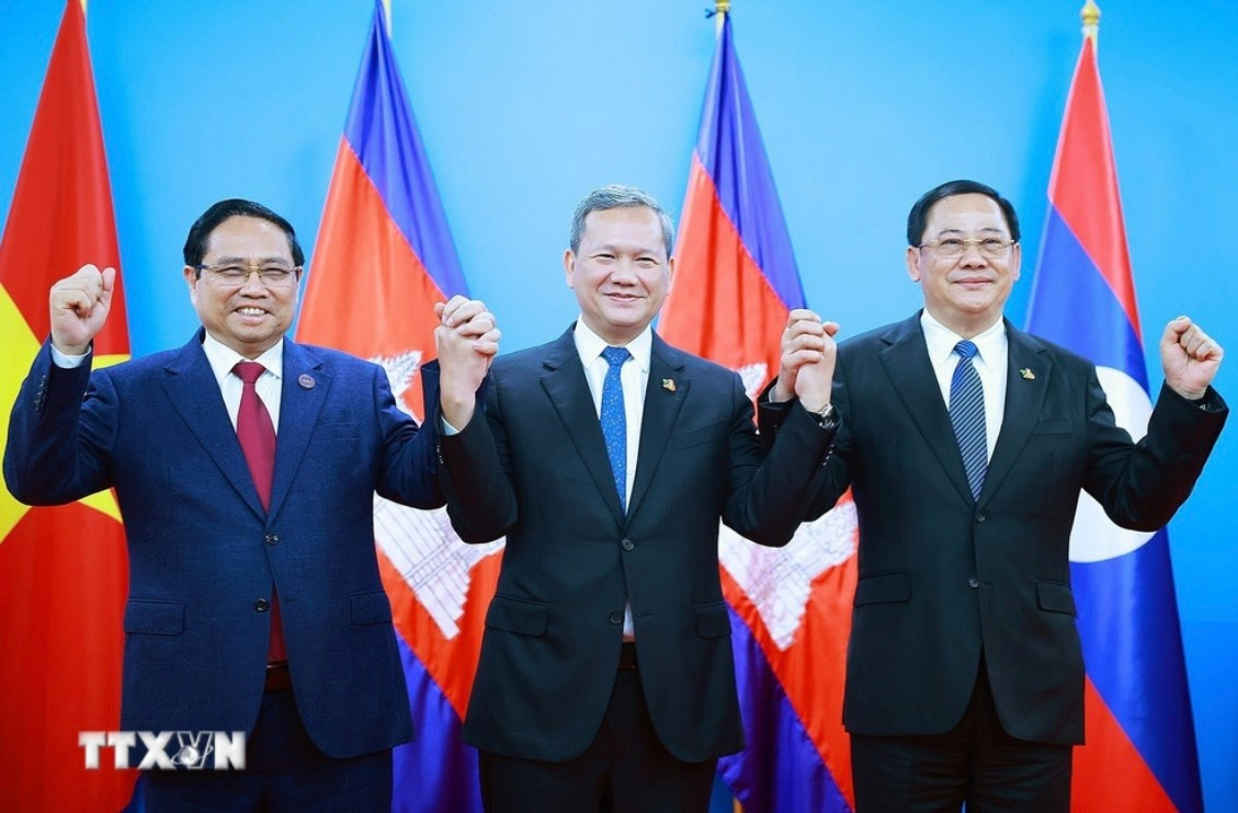 Thủ tướng Phạm Minh Chính trong cuộc gặp Thủ tướng Campuchia Hun Manet và Thủ tướng Lào Sonexay Siphandone. Ảnh: TTXVN