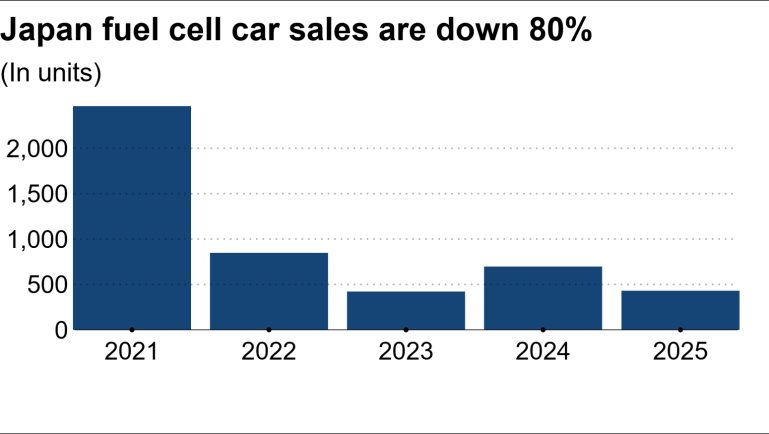 Cụ thể, hạ tầng hỗ trợ xe chạy bằng pin nhiên liệu (FCV) đang teo tóp đáng kể, tạo ra một rào cản khổng lồ khiến doanh số dòng xe này lao dốc không phanh. Tại Nhật Bản, thị trường từng được kỳ vọng là "vương quốc hydro", doanh số FCV mới đã bốc hơi 83% vào năm 2025 so với năm 2021, xuống còn 431 chiếc.